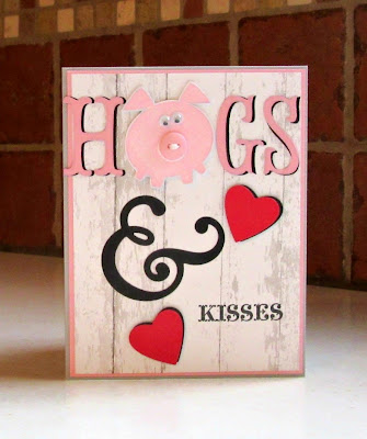 I had to combine products from a lot of different companies to make this work! Letters were die cut from Cricut Storybook cart. Ampersand is Mama Elephant. The stamped "kisses" is a masked Hero Arts stamp from the set "Sending You Love". Hearts were die cut using a WPlus 9 die. And that adorable piggy is from a retired Stampin' Up set "Button Buddies".